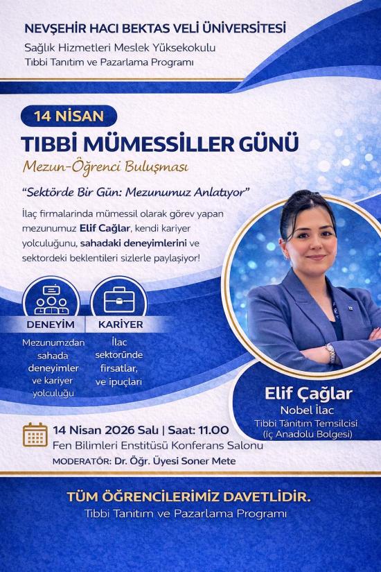 14 Nisan 2026 Salı günü saat 11.00’de Fen Bilimleri Enstitüsü Konferans Salonu’nda gerçekleştirilecek etkinlikte, Nobel firmasında İç Anadolu Bölgesi Tıbbi Tanıtım Temsilcisi olarak görev yapan mezunumuz Elif Çağlar konuşmacı olarak yer alacaktır.